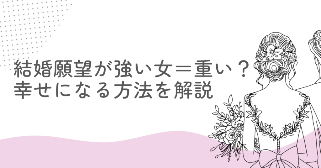 「早く結婚したいのにうまくいかない」 「重いと思われてしまうのが怖い」 と、結婚願望が強いことに対して悩んではいませんか? 私も好きな異性や周りに結婚願望を全面… -